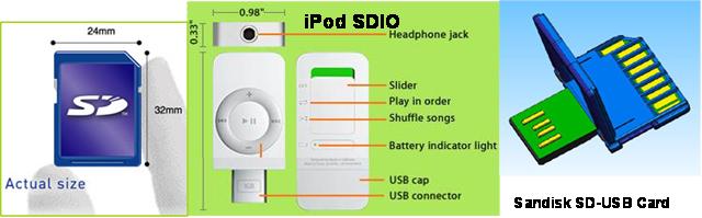 I had seen SDIO devices from companies like Pretec    that could be connected to smartphones. So I decided to create a picture of what a iPod SD could look like. I took  the Shuffle’s Picture from Apple’s  site, Cropped the middle part  that  houses the battery. I have given the resultant diagram below.  for comparison, i added the SD Card  in actual  size.